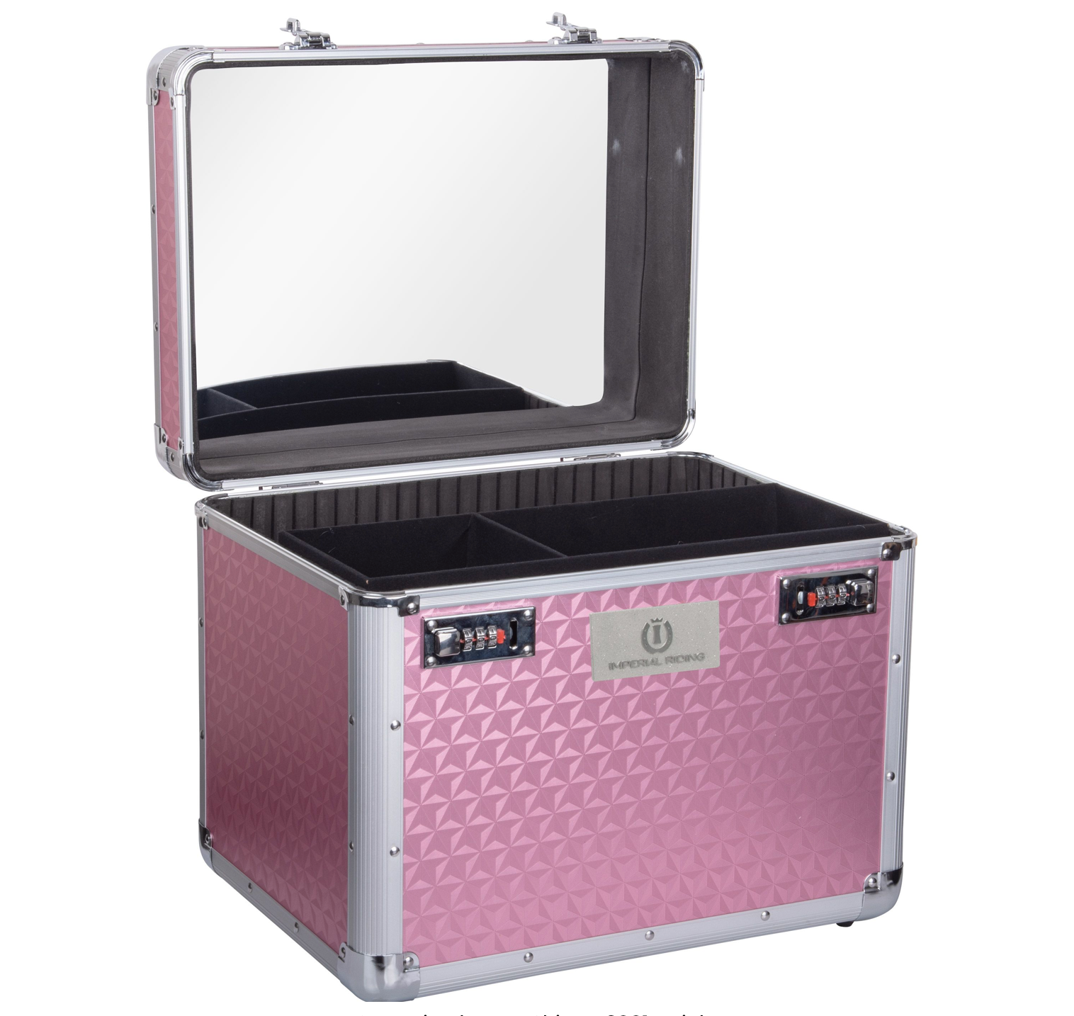 Imperial Riding Shiny harjapakki. Tilavassa ja kauniissa hoitolaatikossa on hyvin tilaa harjoille, sekä pulloille ja purkeille. Näppärä numerolukko, siirrettävät väliseinät ja peili kannen sisäpuolella.